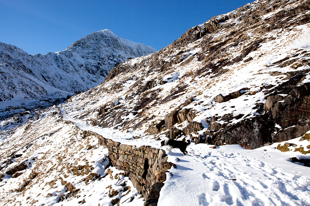 continuing on until we reach Llyn Llydaw , Mol is loving playing in the ever increasingly deep snow, this lake is quiet often calm giving good reflections and as i reach the causeway that goes over the lake, i stop to shoot her in the snow. its a pity it has clouded over a bit, but its patchy and will clear again.